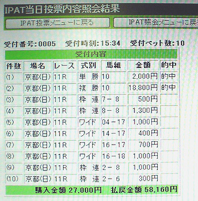 皐月賞は人気薄のヴィクトリーが逃げ切り、東京優駿は牝馬のウォッカが勝つという大番狂わせがあった今年の牡馬三冠ロード。それだけに最終戦の菊花賞は抜けた馬が不在の混戦ムード。一応1番人気は無傷の4連勝で駒を進めて来たロックドゥカンブが推されましたが、キャリア不足・鞍上への不安・血統的な距離不安・相性の悪いセントライト記念組、と不安要素も多く単勝も3・8倍まで。 ワタシも頭を悩ませていたレースなのですが、金曜日にとある裏情報に詳しい方から「菊花賞はアサクサキングスで間違いないよ」との話が。この方、先日もスプリンターズSでアストンマーチャン・サンアディユの馬連に2万ぶっこんで22万にした強者なので(安田記念も1点買いで馬連20倍ゲットしてたり)、そのツキに乗ってみる事にしました。更に土曜の夜にここでも情報を公開してみたり。