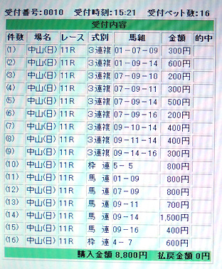 ほんで今日のGT、朝日杯FS(2歳限定、中山芝1600m)。 過去の実例だと東スポ杯好走組が強い事から、素直に◎スズジュピターから行ったんですが・・・5着_| ̄|○ やっぱGTで善臣はダメだ・・・ ○に推したゴスホークケンが華麗に逃げ切ったレースだったんですが、2着に無印の人気薄・レッツゴーキリシマが入った事で、堅い事で有名なこのレースが馬連8,290円の波乱。他に挙げていた馬は、▲サブジェクト13着、△キャプテントゥーレ4着、アポロドルチェ11着。実績馬が皆コケましたね・・・。 でもまぁ昨日の鳴尾記念の貯金が大きいので、再来週の有馬記念までなんとか資金は持ちそうです(来週ヘンな買い方さえしなければね・・・)。