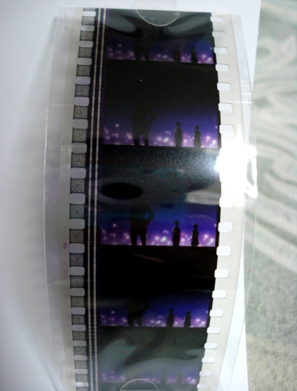 そうそう、各所で話題になっている同梱のフィルムカットですが、ワタシのはこれでした・・・そう、ヤシマ作戦の直前にミサトさんがシンジとレイに作戦の説明をするシーンですね。シルエットではありますが、一応人気キャラ揃い踏みの絵なので“当たり”の部類なのかな(^-^ 中には「真っ黒」とか「トウジとケンスケが行った便所の便器」とかの人もいるようなのでw(それはそれでネタとして美味しいんですが〜)
