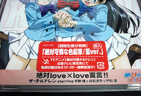 で、『絶対可憐チルドレン』ED。なにやら“封入特典・色鉛筆”と記してあります。「色鉛筆?一体どうやってCDケースの中に封入するのよ?」と思い、中を開けてみると・・・