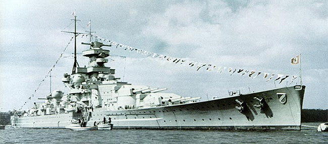 『シャルンホルスト』は第2次大戦直前の1939年1月に竣工した、ドイツの最新鋭戦艦でした。3連装28cm主砲3基と火力は他の国の戦艦に比べて弱かったものの、全長230m、排水量38,000d、速力32ノットと大きな船体に比して高速力を誇る、第一級の戦艦でした。また、純白に塗られた船体と、大戦後期に登場したアメリカの新鋭戦艦を彷彿とさせるシャープなシルエットは当時から人気が高く、ワタシもドイツの戦艦では『ビスマルク』級よりも『シャルンホルスト』の方が優美で好きだったりします(^-^)ノ