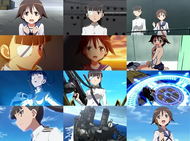 各国のエースたちもかなり個性派揃いでなかなか楽しませてくれそうです♪声優的にも名塚佳織・沢城みゆき・田中理恵・園崎未恵・野川さくら・斎藤千和・小清水亜美・門脇舞以と堂々たる布陣です。 さて、人類の存在を脅かす機械化獣「ネウロイ」と戦うために集められた、魔力を持つ少女エースパイロット集団「ストライクウィッチーズ」。その根拠地に向かう芳佳と美緒を乗せた『赤城』以下の艦隊の前にネウロイが襲来!早速激しい戦闘となります。 ネウロイの攻撃の前に次々と傷付く駆逐艦・・・おっと、武勲艦として有名な『天津風』の姿もあるじゃないですか! 兵装が1939年の物ではなく、1944年当時の物(第2主砲を撤去して25_3連装機銃2基を設置し、後部マストに13号レーダーがあるので)なのは、ネウロイとの戦いで空中への脅威が増したので早めに改装した、と自分で結論付けてみる。それよりも、『赤城』の甲板上の戦闘機が、ちゃんと96式艦上戦闘機(零戦21型の配備は1941年になってから)なのは感心。