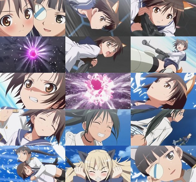 初めての飛行でいきなり発艦に成功し、空に駆け上がってくる芳佳に驚く美緒。更にその広域バリアは自分の物すら凌ぎ・・・。 早速芳佳との連携プレイを試す美緒。自らが囮となって攻撃を引き付ける間に、コアを露出させて芳佳が叩く。1回目は失敗したものの、2回目はコアの露出に成功。しかし接近し過ぎていたために、体制的に射撃が出来なくなってしまう芳佳。そこに遠距離からの砲撃が一閃。ネウロイはコアを砕かれて空中に四散するのでした。 遠距離砲撃を成功させたのは、危機を知って駆け付けたストライクウィチーズ隊のフランチェスカの砲撃でした。美緒の危機を救い、どさくさに抱き付こうとしたペリーヌですが、そのポジションに芳佳がいる事に憤慨。フランチェスカが縞ぱんで、ペリーヌが百合と。とりあえず覚えたぞw