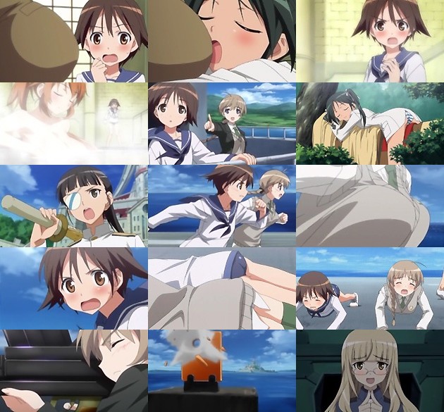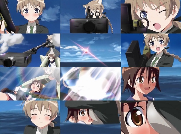 股間に芳佳の温もりを感じて(w、ようやく落ち着いて狙撃を行えるリネット。相手の回避方向を読んだ5連弾で見事コアを撃ち抜く事に成功します。歓喜のリネットは芳佳に抱き付いて2人は海に落下・・・この時、リネットの半ケツ見せローレグにもやはり規制が(;´д`) それにしても、ストライカーユニットってプロペラ回ってましたよね?抱き付いたりしちゃ危ないんじゃw それに、あんなの付けて海に落ちても溺れないとは・・・うーん、謎多きアイテムですストライカーユニット。