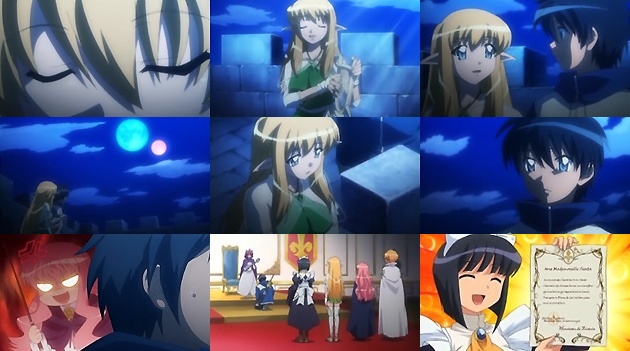 才人たちは学園に戻る事に。ティファニアも一緒に・・・と才人は勧めますが、人とのコミュニケーションに不慣れなティファニアは王宮に残る事に。そんなティファニアに「運命は流される物ではない、自分の力で立ち向かう物なの!!」と叱咤するルイズ。そして最後にようやく才人を助けてくれたお礼を伝えるのでした。 さて、学園に戻って来た才人・ルイズ・シエスタ。アンリエッタの計らいで学園では大歓迎ムード。ギーシュやキュルケ、モンモランシーといった懐かしい顔ぶれも・・・。 そしてアンリエッタによって、才人の騎士団・オンディーヌ騎士団も旗揚げされていました。但し平民出の才人が隊長だと色々と問題があるので(この辺まだまだダメだなぁ)、ギーシュが隊長、才人は副隊長という形で。騎士団の面々の他にも、新キャラのベアトリスも何気に登場。次週からは編入生という形でティファニアも学園に来るようなので、また騒がしい日々が始まるようです。 ・・・これでやっと本当の第3期が始まるかな?(^_^;
