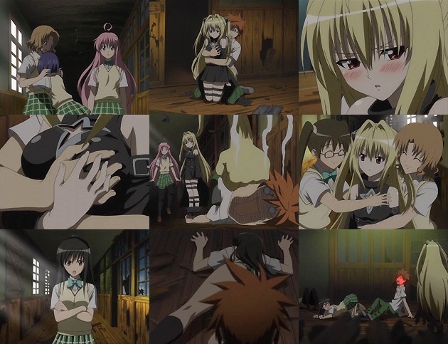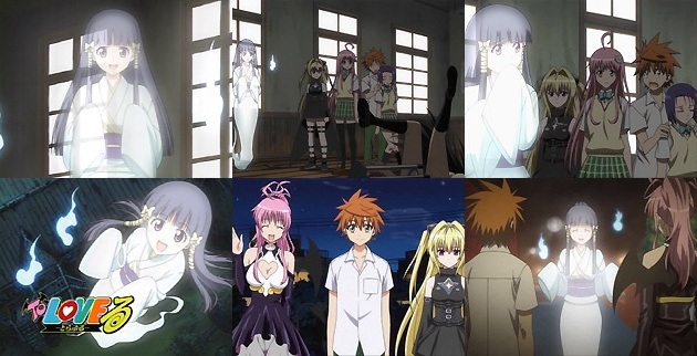 お約束の「旧校舎の幽霊」話。実はそのテの話が大の苦手である春菜。それを察したリトも旧校舎探検を止めるように言いますが、ララ・里紗・未央の勢いに勝てる筈もなく、結局5人で探検開始。途中、旧校舎の図書館に入り浸っていたヤミちゃんと、悪巧みを知って追って来た唯(この娘の場合、とらぶるに自分から首突っ込む事多いよなぁw)も加えて7人で探検する事に。メンツ的にはなかなかの駒が揃ったんですが・・・