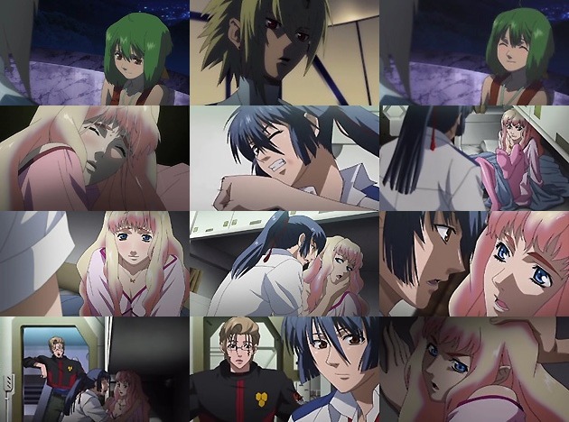 病院にもホテルにも行きたくない、というシェリルを、止むを得ずSMSの宿舎(マクロスクォーター内)に連れて行くアルト。気付いたシェリルはアルトにお持ち帰りされたと勘違いして激しく抵抗・・・別に好きなんだったらいいじゃんね? 女心は複雑です。真相を聴いたシェリルは恥じ入って詫びますが、シェリルのイヤリングに過剰な反応を示したアルトが急接近!・・・しかしここでミシェルに見付かり逢引き終了w