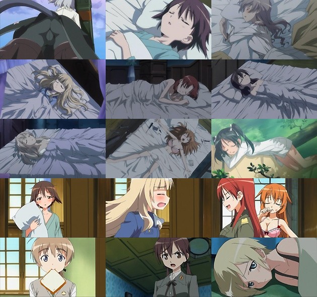 サーニャが夜間哨戒任務から帰還し、ストライクウィッチーズ隊の夜が明ける・・・サーニャのローアングルから見える見事なフロントラインは、これまでなら十分規制対象のような(^_^; それぞれの寝姿が特徴的でオモローですね。寝間着を着る:芳佳・リーネ・ペリーヌ、下着のみ:ミーナ・エイラ・シャーリー、全裸:バルクホルン、制服のまま:ルッキーニ、と。ちなみにワタシは抱き枕を愛用してるのでリーネちゃんスタイルです(聞いてねぇ)。 朝の準備も人それぞれ。「メガネ、メガネ〜」なペリーヌ、食パン咥えて「遅刻、遅刻〜」なリーネといったベタなお約束展開の中、きちんと制服を着こなしているミーナさんとバルクホルンはさすがに規律に厳しいカールスラント軍人ですな( ̄▽ ̄) ・・・いや、カールスラント軍人にあるまじきずぼらな朝を迎えているのが1人・・・ ハルトマン、ぱ ん つ は い て な い (* ̄▽ ̄*)