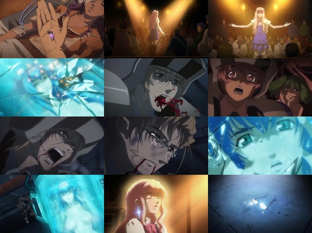 ・・・216個以上いるよなぁこれ(^_^; その中から魔眼で本体のコアを見付け出す坂本少佐。そして芳佳とミーナの強力を得て見事コアの破壊に成功・・・しかし、ネウロイの破片をシールドで防いだ時に、坂本少佐のシールドが破れ破片が顔を掠めます。強張るミーナの顔・・・