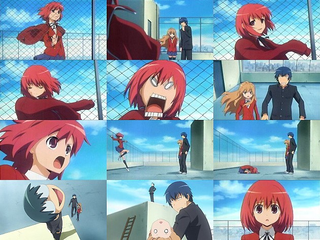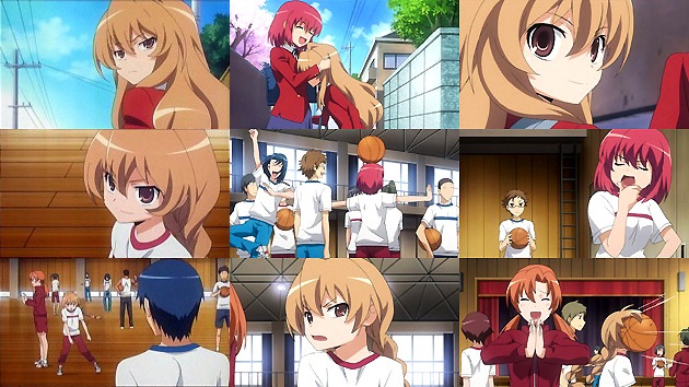 恋愛同盟締結、共同戦線を展開する事となった竜児と大河。バスケの授業で姑息な手段を用いて北村とペアを組もうとした大河、策に溺れて(つーか竜児のコントロール悪過ぎw)顔面キャッチ。つーかバスケットボールって顔面に当たるとホント痛いよねー(経験者)。 しかし高校で男女の体育が合同ってのはあるんですかねー?