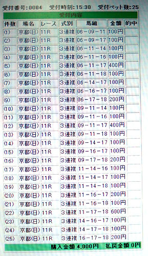今週の競馬コーナー。今週のGTは秋華賞です。 ・・・見ての通り、三連複絨毯爆撃25点買いを行いましたが、レースは超が付く大波乱!1着が11番人気、2着が8番人気、3着が16番人気(ついでに言えば4着も13番人気)と、これでもかと人気薄が上位を占めて、三連単は驚きの1000万馬券!! 1番人気の11番トールポピーは10着、2番人気の17番レジネッタは8着に惨敗。どちらかは必ず3着以内に入ると思ったので、11番&17番軸で比較的人気薄にも流した買い方していたんですけどね・・・ ま、何となく荒れそうな予感もあったので、投資額を絞っていたのがせめてもの救いですね(^_^;