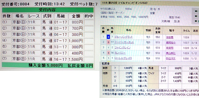 さて、今週の競馬コーナー。今日のGTは京都競馬場で行われるマイル王決定戦・マイルチャンピオンシップです。 15時アキバ待ち合わせだったので、出掛ける前にPATで購入。軸は1番人気の17番スーパーホーネットでまず間違いない、との判断。但し鞍上の藤岡は未だGT未勝利で、今週のインタビューでもガチガチになっていた事を考えると1着固定は危険なので馬連勝負。相手本線は16番カンパニー、続いて7番ブルーメンブラット。3番スズカフェニックス、1番ローレルゲレイロの人気どころも押さえ、遊びで6番ショウナンアルバ、13番サイレントプライド、15番スマイルジャック(誰かが「マイルをジャック!」って言ってたのでw)まで流しておきます。 このレース、1600m戦ですが、事前に安藤勝騎手も「前走1800m〜2000mを走ったが有利」と言っていた通り、ある程度のスタミナも要求されます(それだけに、前哨戦と言われるGUスワンステークス[京都芝1400m]組が毎年苦戦してたり)。よって ◎スーパーホーネット(前走1800m) ○カンパニー(前走2000m) ▲ブルーメンブラット(前走1800m) というワタシの結論に至っています。