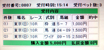 馬券は絞りに絞って3点。ディープの5枠からアサクサ・マツリダのいる7枠への枠連勝負、ウオッカとディープの馬連、それにディープとアサクサのワイド(これが本線)で勝負です。