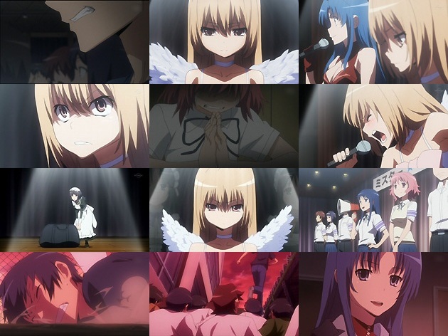 大河父への怒りというより、その本性を見抜けずに信用し、それによって大河や実乃梨まで傷付けた自分に激しい怒りを覚える竜児。ステージでは段取り通りに「会場に来ている逢坂さんのお父さーん♪」的な流れになっていて、大河が大恥をかいてしまいます。あぁ・・・観ていて心が痛い展開。そんな中、ステージにたたずむ大河に涙を流しながら大きな拍手を送り出すみのりんの友情に激しく感動!くぁーっ!最近低迷していたみのりん株ここで再び急上昇!! みのりんの拍手によって場の雰囲気はガラっと変わり「手乗りタイガー、こうやってみると可愛いんじゃね?」といった空気に。更にそれに応えた大河は一発芸でスポーツバッグに入り・・・エスパー伊東かよ!とは全国1907472659128人の視聴者のツッコミw 見事ミスコンで優勝した大河。しかしここで突然会長のサプライズイベントが始まり、ミスターコンテストが開幕。校内1周コースを駆け抜けて、1位の者が大河にティアラを進呈してフォークダンスで一緒に踊る権利が・・・。父親の件で大河を傷付けたと思っている竜児は真っ先に参加し、必死の形相で集団の先頭を駆け抜けます。 そんな竜児の真っ直ぐな想いに「へー」と感心する亜美・・・この娘の気持ちはワタシのような男にはなかなか理解出来ませんなぁ。