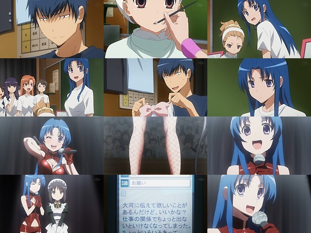 亜美キャプが多いのはMc−LINERSの仕様ですのであしからずw ミスコン出場を控え、大河にメイクを施す亜美・・・何だかんだで仲良いのがいいね(本人たちは絶対否定するでしょうがw)。内容的には大河回なんですが、ポイントポイントで亜美が美味しい所を持って行ってますねこの文化祭編は。 竜児によって完成する大河のステージ衣装。クラス女子の間では竜児のキャライメージが随分崩れたんじゃなかろーかw そしてミスコンの開幕・・・亜美の網タイツ♥(親父ギャグじゃないよ) つーかこの司会は出場者を完全に食っちゃうだろ(^_^; あ、でもモブっ娘のメイドさんかなり好み♪ 大河一世一代の晴れ舞台・・・しかし大河父はなかなか現れず。そんな時、メールの着信を伝える竜児の携帯。その内容は・・・酷い、あまりにも酷過ぎるコレ。行けない事を竜児から伝えてくれと言うのもあんまりだが、更に奥さんと仲直りしたから大河との再同居もなかった事に・・・って、どんだけ身勝手なんだこの親父。ダブルオーのセルゲイが理想の親父像だとしたら、この大河父は最低の親父像ですな。こんな父親には決してなるまい(いやアンタはそれ以前に(ry)
