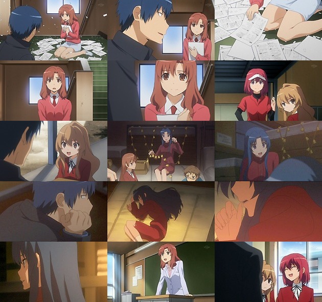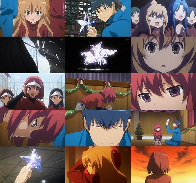 ツリーのてっぺんには、大河が自宅から持参したクリスタルの星を飾る事に。その星は幼い日のサンタの思い出が詰まった大河の宝物。そしてそれを北村が受け取って取り付け、遂に巨大ツリーは完成します。暗幕の中、試験点灯を行ったツリーの幻想的な光景に、皆の心は夢の世界へといざなわれます。 しかしその夢を砕いた一瞬の出来事。体育館のガラスを破り、(なぜか)暗幕をも突破したボールがツリーを直撃。ツリーは横転し、その頂に輝いていたクリスタルの星は砕け散りました。 そこに現れるみのりん・・・自分の打った打球が引き起こした悲劇に、みのりんだけでなくその場にいた者も視聴者も凍り付く。 泣きながら大河のクリスタルを直そうとするみのりん。これまでの展開が嘘のように重苦しい空気の中、救いの存在となったのが竜児でした。自分の責任で直す、と言うみのりんに 「壊れたら直せばいい」 「元通りにならなくてもそれは光る、何度でも何度でも直せばいい」 と元気付け、一緒に星を直すのでした。もうね、この竜児の優しさにまたまた涙ですよ(T_T) この時の竜児には、みのりんの事が好きだから点数稼ぎに・・・なんて打算は一切無い。傷付いた友人を親身に思い、その心の傷を癒そうと一生懸命なだけ。もうね、これで竜児に惚れない女はいないでしょ!男のワタシだって惚れちまったんだから!!(アッー!)