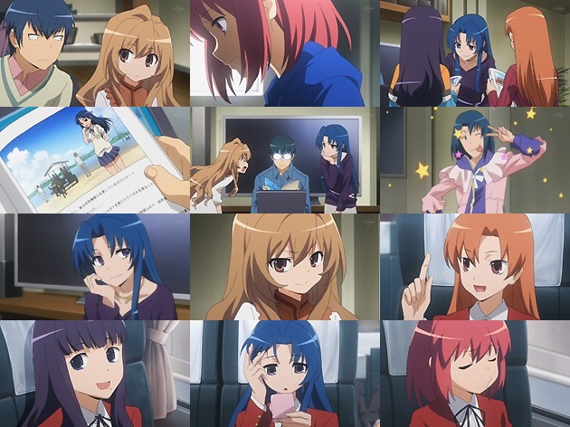 後ろから来た大河がカバンを2人に放り投げて、そのまま一撃離脱w 大河のカバンを持って2人きりで登校させるため・・・大河の作戦に気付いたみのりんがぐぬぬ表情です(^_^; 手が触れ合って頬を染めたり、みのりんの恋愛意識レベルも結構高いんですけどね。 いつも見ているから、髪形の少しの変化も分かる・・・とか、竜児にしては結構積極的なアプローチを開始。しかし2人で大河のカバンを真ん中に持って歩く描写は、まだ2人の間に存在する大河の大きさ、そして未だおままごとから抜け出せていない事を暗示しているようです。そんな2人を昇降口で見掛けた亜美・・・「まーだそんな事やってんの?」的な冷たい表情です(^_^; さて、修学旅行の班分けで喧々囂々の教室。結局いつものメンバーになるのはお約束w