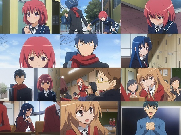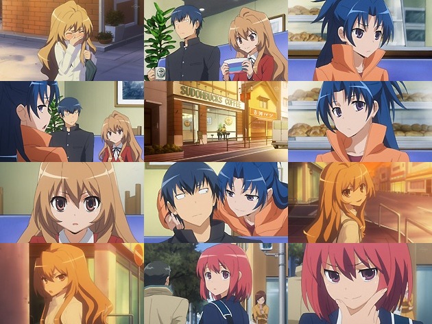 お馴染み古河パン隣りのスドバでお茶する竜児・亜美・大河。クリパの夜の仔細を聴いた亜美は竜児がフラれた経緯を知り、 「遂に大怪我したわけだ」 としみじみ。そして語られはしなかったあの夜の大河の号泣も、亜美はきっと理解しているんでしょうね。 「大怪我したのがアンタだけなら良かったのに」 もはや亜美は竜児争奪戦への参加は放棄しているんですかね?竜児・大河・実乃梨の関係を、視聴者と同じ視点で傍観している風でもあります。これで五角関係は三角関係までに絞られたって事でしょうか? 竜児とみのりんの関係修復に全面協力を申し出る大河。自分が認めた者同士だから・・・大河も本当に不器用な娘だよなぁ。どうでもいいけど、大河って振り向きざまの表情が絵になる娘ですよね。 さて翌日、通学路で一緒になった竜児とみのりん。竜児はみのりんの本当の気持ちを聞き出す事が出来るのか・・・
