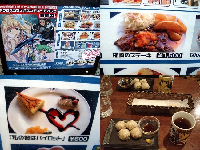 食事の後はラジオ会館→とらのあな→アニメイトといつも通り巡回し、キュアメイドカフェで休憩。キュアメイドカフェでは明日までマクロスカフェを開催していまして、特別メニューが数多く用意されています。入店待ちの列に並びながら、メニューの看板を見ながら後輩といつもの阿呆会話。 「『私の彼はパイロット』って、赤と黒の煙吹いてたら堕ちるんじゃね?」 「『柿崎のステーキ』って、ひょっとして柿崎の肉?」 前に並んでたお姉さんが「ブッ!!!」と噴き出しながら肩を震わせてた。 入店して我々が注文したのが『娘娘セット』。小龍包と烏龍茶のセットで、湯呑みが付いて¥1,500也。店内はマクロスFで使われた楽曲が延々流れていて、まさにマクロスカフェ。でもSMS小隊の唄までかけるのはやり過ぎw
