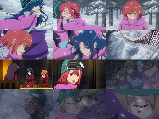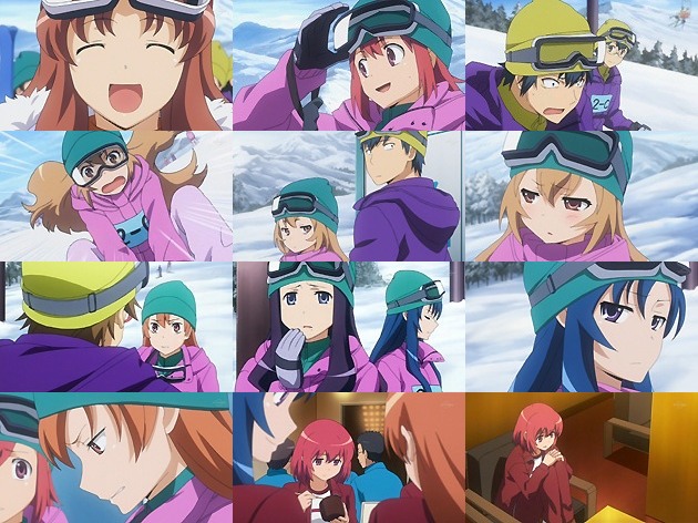 一部始終を押入れの中で聞いてしまった大河と男子たち。そりゃ途中で出て行けないわな、ありゃ。 翌朝。さすがに凹む亜美に、事情を知らない振りして声を掛ける竜児ですが、そこに大河とみのりんが乗ったソリが突っ込んで来て、亜美を刎ね飛ばします。普段なら「ちょっとー!」と表面上怒るだけであろう亜美ですが、何しろ昨晩の出来事があったばかりの上、加害者の1人がみのりんという事で冷静さを完全に失った亜美は猛然と食って掛かります。さぁ、ゲレンデでラウンド2・ファイッ!!
