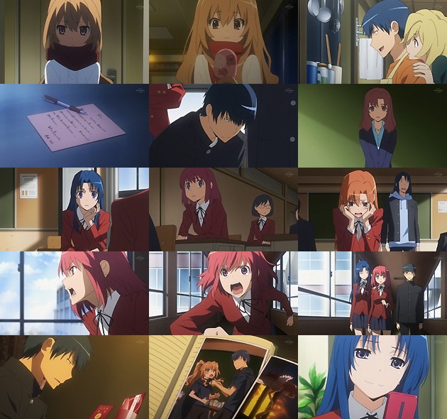 翌日。母親の元へ向かった大河がこの学校を去った事を告げるゆり先生。騒然となるクラスの面々。そんな中、竜児だけがうつむいて無言なのでした。大河の旅立ちを教師らしく皆に諭す30歳先生にちょっと感動・・・しかしクラスの面々は全員ケータイで大河にメールをw さすが現代っ子♪(こういう言い方がおっさんなんだよ俺)