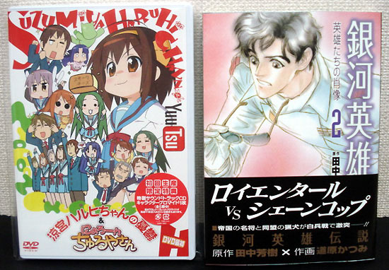 明日発売の『涼宮ハルヒちゃんの憂鬱&にょろーんちゅるやさん』DVD1巻、それに買いそびれていた『銀河英雄伝説 英雄たちの肖像』コミック2巻。