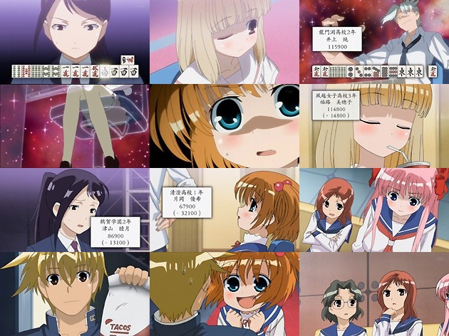後半戦スタート。井上が「タコスよりも焼き鳥の方が似合ってる」と言っていましたが、麻雀用語でその半荘で一度も和了れなかった人の事を“焼き鳥”と言うんですよ。一口メモでした。 4人のタテのカット絵はスト魔女でも何度か使われてましたね。GONZO5スタの得意技ですな。 さて、タコスパワーで今度こそ序盤から飛ばす・・・はずが、またも井上の流れを断ち切る鳴き技でペースを乱されます。またも東場で和了れず絶望感に打ちひしがれるタコスさんですが、合宿で覚えた麻雀の楽しさを思い出して再度奮起!それでも苦戦が続くタコスさんに、思わぬ所から救いの手が!