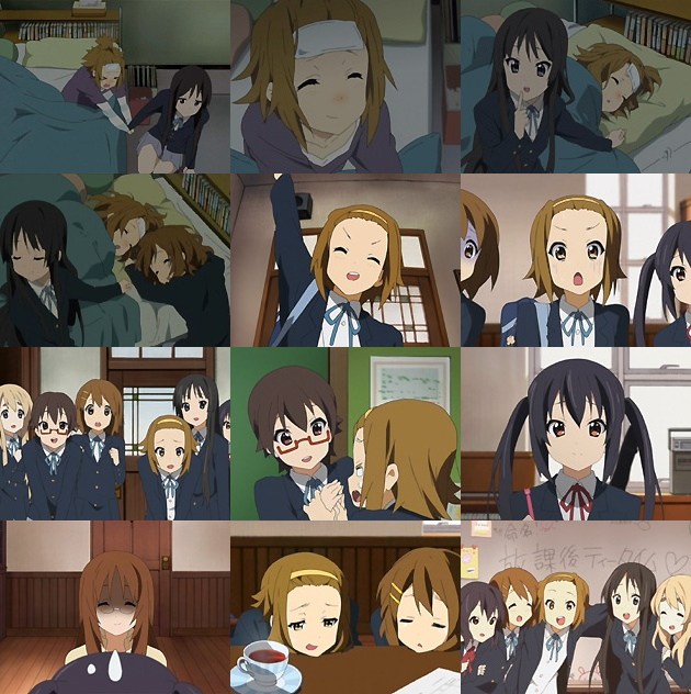 本音で語り合えば、元々親友同士の2人なのであっさり仲直りw 追って見舞いに来た皆ですが、唯は律と一緒になって眠りこける始末(^_^; しかしこれが次回に繋がる伏線になろうとは・・・ 翌日、復活した律ですが、その間誰も体育館の申請書を出していなかった事でまたも大ピンチ!これを救ったのが、一緒になって生徒会長に頭を下げてくれた和でした。そんな和に大感激の律、これからは唯だけでなく、自分の面倒も見て欲しい!と(ォィw さて、先送りにしていたバンド名・・・。結局部員では名前が決められずに喧々囂々としてる間に、さわちゃん先生が勝手に『放課後ティータイム』と命名して申請。まぁ『ぴゅあぴゅあ』よりは良いんじゃないかとw さて、バンド名も決まって再結束した軽音部ですが、ここで律に風邪を伝染された唯がダウン!どうなる学園祭!?次回、最終回を割目せよ! ・・・って、あれ?第12話で最終回!?と思ったら、第13話は番外編でちゃんと存在するようで。クラナド戦法ですな。