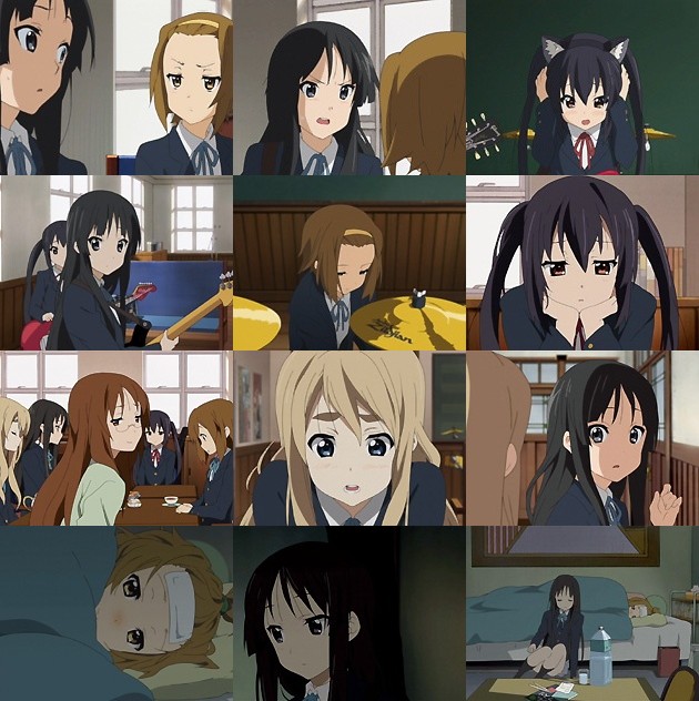 遂にブチ切れる澪。空気の重さを読んだあずにゃんは「練習しましょう!」と言って自らネコミミを着けて空気を和ませようとし、何とか練習に入らせます。つーか後輩にこんな気を遣わせちゃダメでしょ先輩方! しかしいざ演奏を始めてみると律が絶不調。そしてそのまま帰ってしまい、放課後の練習にも顔を出さなかったのでした。 翌日も練習に参加しない律。このままだとバンドが成り立たない大ピンチ。他のドラムを入れたら?とあっさり言うさわちゃん先生に「律さん以外のドラムなんて考えられません!」と珍しく語気を荒げるムギ。あずにゃんと言い、ムギと言い、この危機を何とかしようと必死になっているのに、元々期待してないさわちゃんはともかく、これまで散々皆に迷惑掛けて来た唯が何も行動起こさないとは・・・ちょっとガッカリだなぁ。 律の不調と欠席、それは風邪で熱を出していたのが原因と分かり、澪はひとり律の部屋を訪ねるのでした。