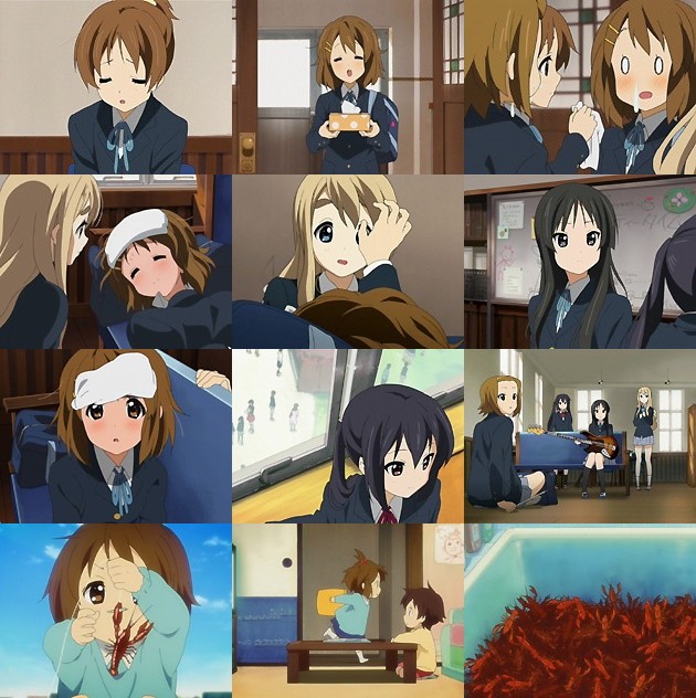 アバンの紬たくあんネタ・・・元は原作コミックのカバーを外すとあったりするんだけど、アレに気付いてない人結構いたりするかも。 学園祭ライブまであと5日。唯の病状は良化の兆しが全く見えず・・・今流行のヘンなインフルエンザじゃあるまいな。そんな唯を心配し、代われるなら代わってあげたいと真剣に悩む憂。風邪をうつす方法を問われて真剣に口移しとか言う憂ちゃんおちけつ。 唯が風邪をひいた原因は、どうも律にうつされたからだけでなく、ステージ衣装を決める時に、フレアミニスカ浴衣があまりにも可愛いかったので、1日着ていて風邪をひいたと言う・・・いかにも唯な理由でした(^_^; それにしてもムギは何を着ても似合います。そりゃ澪だって感覚壊れるさw