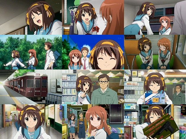 映画の資材の調達のためにみくるを指名するハルヒ・・・極端に警戒するみくるの言動は、コンピ研からPCをせしめた時の事を考えたら至極当然だわなw しかし今回はあくまで合法的に資材を調達するようで、ハルヒとキョン、そしてみくるは3駅先の商店街へ。乗っていった電車は阪急電鉄の5000系でほぼ確定かな。で、後に『サムデイ・イン・ザ・レイン』でもストーブ調達でお世話になる電器屋のおやじからハンディカムを入手。続いておもちゃ屋ではエアガンも・・・。ハルヒが交渉中、みくるを指差して話しているのが何とも嫌な予感が致します(^_^; さて、中途半端ながら今回はここまで。次回、また体育祭のシーンから始まらない事を切に願いますw
