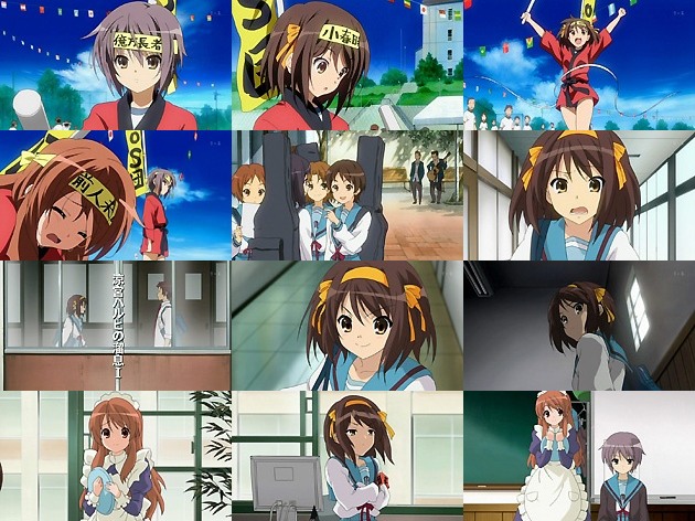 アバンは体育祭。時期的に9月にやるんですね。ちなみにウチの高校は5月だったなぁ。クラス替えも間もない時期で、結束を強めるのには有効なタイミングだったかと。 ハルヒたちが参加しているのは部活対抗リレーですかね。それぞれの巻いている鉢巻には、ハルヒ:小春日和、みくる:前人未踏、長門:億万長者、古泉:古今東西、キョン:危機一髪と書かれています。それぞれの名前が入っているのは一目瞭然・・・という事はキョンの本名の謎に関するヒントがここに?(一機[かずき]とか) ちなみにリレーは長門の圧倒的な走力でぶっちぎり優勝。まぁみくるというハンデがあっても、アンカーのハルヒだけで相当な走力が期待出来たようですが。