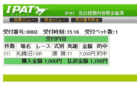 っとその前に。この週末は全く外出の予定が無かったので(あ、選挙は期日前投票済み!)、今日は久しぶりに自宅でPATを使って馬券購入( ̄▽ ̄)ノ ま、重賞だけですけど。