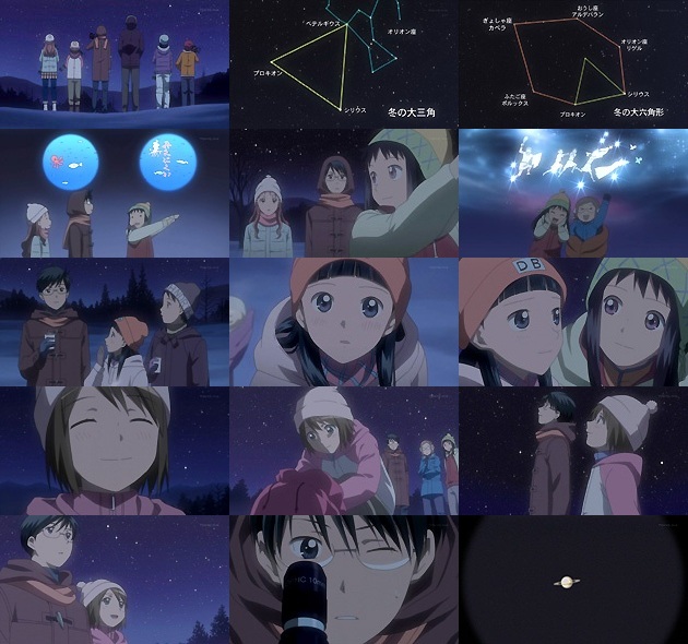 そして長いCパートの開始。今度は合宿組の夜の観測会です。 月の入りを待って観測スタート。月の光のある無しって天文観測では非常に重要ですので。まずは冬の星空の基本である冬の大三角、そして冬の大六角から。ちなみに冬の大六角は近年呼ばれるようになったもので、ワタシが天文ファン現役だった1980年代には無かった呼び方ですね。 9月2日のキャプ日記に記した >>冬の空は空気の揺れが激しい事が多く、 >>星が滲みがちになるのであまり観測に向かないのです という事象を今回作品中で解説してくれましたね。思わずニンマリ♪ そしておうし座のプレアデス星団(和称「すばる」)の話も・・・。