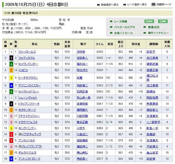 怒涛の34点買いも◎○が5着・4着では話にならず・・・。 それにしても勝ったスリーロールスですが、デビュー戦があの伝説の新馬戦(2008年10月26日京都5R)だったんですね。1着アンライバルド、2着リーチザクラウン、3着ブエナビスタ、4着スリーロールス・・・この新馬戦からクラシックが4冠も出ちゃうとはw
