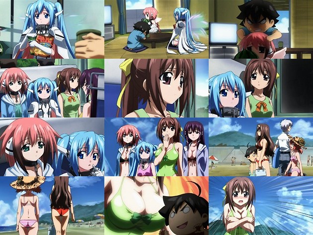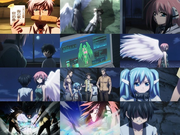 智樹と遊び足りない、と言うそはら。上手い事に海の家で行われたカレー大食い大会で優勝していた英四郎が海の家の宿泊券をゲットしていたので(ここでも商品ショボ!)、皆で一泊する事に。つーか英四郎は制服姿のまま、海に何しに来たんだろうw 智樹の夢にはまたあの天使が。イカロスだけでなくニンフの事も知っているようですが・・・。目を覚ました智樹は眠っていなかったイカロスを連れて海へ。昼間たたんでいた羽を伸ばさせてあげますが、帰り道に地元の青年に声を掛けられているニンフを発見。青年たちは純粋に夜の海に女の子1人では危ないから声を掛けたようですが、ニンフの毒舌に気分を害し・・・。青年の1人が割って入ろうとした智樹の腕を掴むと、またもイカロスが戦闘モードに入ってしまい・・・。智樹の一喝でイカロスは元に戻り、青年たちは逃げ出してしまいますが、そろそろイカロスの製造された背景などを知りたい所です。