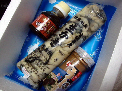 そうそう、昨日誕生日だったのに合わせて、仙台に住む妹が松島名産の牡蠣を贈ってくれました( ̄▽ ̄)ノ ご丁寧に牡蠣用のポン酢たれと、ワタシが大好きな粒ウニの瓶詰めも一緒に♪ 仙台に程近い松島は広島と並ぶ日本有数の牡蠣の産地。広島産よりもやや小ぶりながら身が濃縮されているのが特徴で、味は甲乙付け難いですね。 ちなみに牡蠣の旬ってのは、月のスペルに「R」が付く月(September,October,November,December,January,February,March,April)と言われており、寒い時期が一番美味いのですよ。これ豆知識ね。逆にウニは夏が旬なのですにょ♪