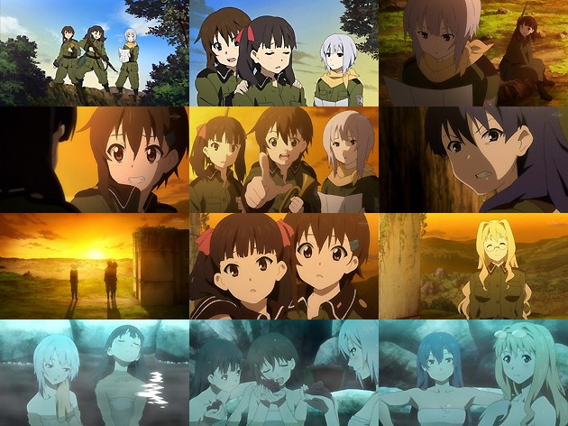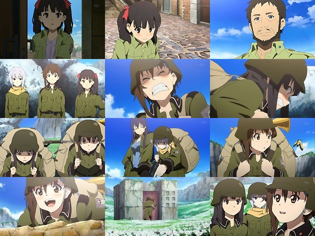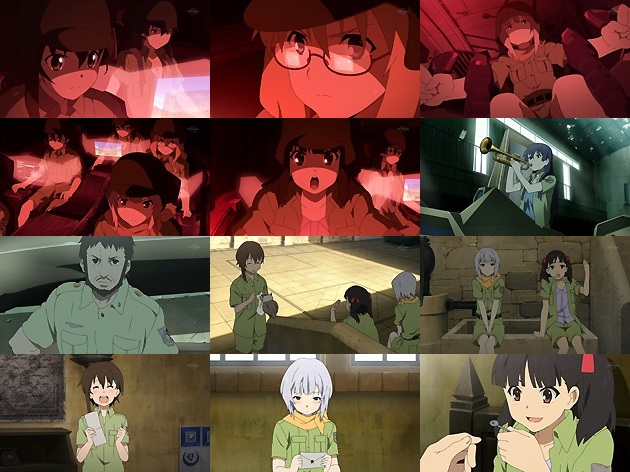 駆け寄ってみると、その丘の下には夕陽に染まる戦艦大和が・・・じゃなくて、荒涼たる大地と朽ち果てた文明の痕跡が。これがカナタたちが守る国境、そしてこの世の果ての姿。そしてそこに現れた隊長によって、このオリエンテーリングの目的がこの光景を見せる事だったと語られます。