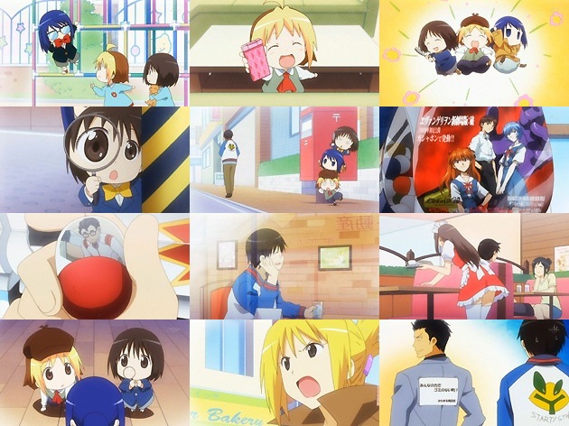 休日につっちーをデートに誘うも断られた杏。真相は単に面倒臭いだけだと思いますがw、それをつっちーの浮気と思い込んだ杏は、桜ビッチからケータイを借りて柊&小梅ちゃんとはなまる探偵団を結成・・・柊、コナン自重な(^_^; さて、当日のつっちーは篭って昼までゲーム・・・。動きが無い対象に対して痺れを切らした杏は「せっかくの休日に出掛けないなんて!」とTEL。つーかそれでいいのか探偵団w その後つっちーは街をブラブラし、見掛けたヱヴァのガチャポンをガチャガチャ・・・ケース絵がそのまんまなのは、さすがガイナックス制作といったところでしょうか。引き当てた日向君はハズレ扱い・・・まぁそこは同意しておく(酷 その後ファミレスに入ったつっちーはウェイトレスさんのミニスカや強調されたバストに鼻の下を伸ばしてます。結局人に会う予定は無い事に気付いた杏たち、そしてそんな園児たちを影でこっそり見守っていた桜ビッチ・・・つっちーの様子に呆れ顔ですw そんなつっちーにピンチが。「いらん」と捨てたヱヴァガチャポンのハズレ(日向君かと思ったら、よく観たらヤシマ作戦の武器セットでした)。それを観た恐喝業を生業にされていらっしゃる方に因縁を付けられ・・・つっちーのピンチに桜ビッチが飛び出します!