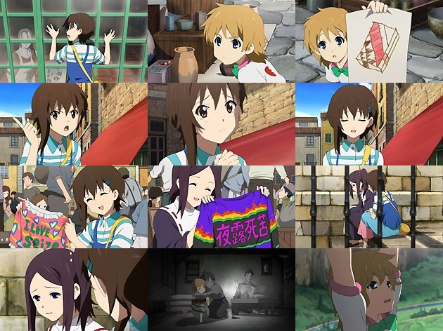 街で偶然マフィアの尖兵と遭遇していたカナタ。あぁ、Aパートと繋がります。 ミシオは母親の形見の箱根寄木細工(なんて日本的w)の箱を市を回って探し、その最中にカナタと遭遇。しかしカナタもその箱は見た事が無く・・・。 ミシオを探しに来たユミナは古着屋でカナタと会って服を見繕い・・・孤児たちが随分派手な服を着ていたようですが、あれってユミナのセンスだったのか(;´∀`) つーか変なTシャツネタはけいおん!で既にげふんげふん。 ユミナがミシオを探しているのを知ったカナタは、崖上の家の屋根で黄昏るミシオを見付けますが、お約束的に屋根瓦が崩れてミシオが崖下落下の危機に!