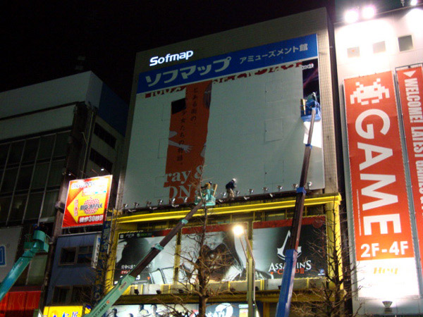 うおぉぉぉぉぉぉっ!!超電磁砲の巨大看板が剥がされてる!!!!Σ(・ω・ノ)ノ! これはなかなかに貴重な瞬間に立ち会ってしまいました。とび職のおっちゃん達によって美琴と黒子の姿は跡形も無く剥ぎ取られ、替わりにKOEIのゲームの看板が貼られるみたいです。イベント尽くしだったこの1日ですが、最後の最後にトンデモイベントに遭遇してしまいましたよw