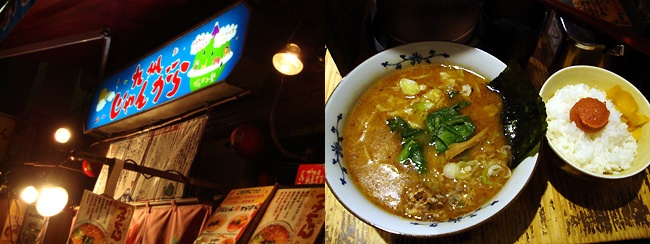 最後の締めは勿論『九州じゃんがららーめん』。いつもはとんこつベースの「じゃんがら」か「むぎちゃん」を注文するんですが、今日は趣向を変えて魚貝ベースのスープの「つけちゃん」(¥800)を注文。ついでに明太子ご飯(¥250)も付けちゃいました♪ 「つけちゃん」と言ってもつけ麺ではありません(つけ麺ってあんまり好きじゃないんですよ)。魚貝ベースのスープは油多めで結構こってり、麺は中太ストレート。具は挽き肉と乱切りキャベツ、それにほうれん草とメンマ、のりなど。 じゃんがらほどのインパクトはないですが、これはこれでまずまずの美味。麺C スープB チャーシュー無 その他具材Cで平均点・・・って感じでしょうか。