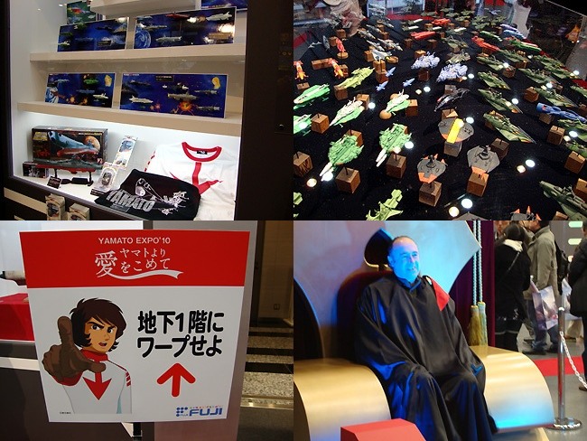 会場のステージではヤマトクイズなんかもやってました(景品はヤマトクルーの制服を模ったTシャツ)。あんま盛り上がってなかったけどw そんな中、異彩を放っていたのが「あなたもデスラー」コーナー。デスラーの黒マントを羽織ってデスラーの椅子に座り、顔の部分に青い光を当てる事によってデスラーに成り切れるという画期的なこのコーナー、ノリノリの外人さん観光客がデスラーに扮してました(デスラーというよりは「3」に登場したガイデル将軍っぽいw)。うわー、俺もやっとくんだったwww