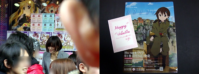 とりあえずドンキの方まで伸びている列の最後尾に並びます。しかしただのクリアファイル配布にこんなに並ぶ訳が・・・と思ったら、案の定カナタ役の金元寿子さんが手渡しで配布という美味しいイベントである事が発覚!2人でしっかり頂いて参りました♪しかも中にはヴァレンタインカードまで☆ まぁ並んだのは10分ちょっとくらいでしたけど、なんか300人くらい並んだみたいですね。全くヴァレンタインだと言うのにこいつらと来たら(お前も、お前もー) スタッフブログにもその様子が写されてますが・・・ちなみに俺らは写ってませんよ?w