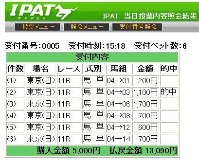 6着に大穴で指名したダイショウジェット。つーかここまで6頭が全部いわゆる「ダート組」。芝転向組は逃げたローレルゲレイロの7着が精一杯で、リーチザクラウンの10着をはじめ、揃って全員討ち死した形です。やはり「餅は餅屋」なんですな。