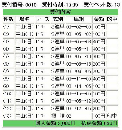 ○はやはり格からアリゼオ。ヒモ荒れを期待して▲には10番人気のゲシュタルトを指名、以下△にはバシレウス、サンライズプリンス、サクラエルドール、ソリタリーキングまで。買い方はローズキングダム1着、アリゼオ2・3着固定の三連単フォーメーション。適当に金額割り振ったら100円分余ったので、あとは▲ゲシュタルトの複勝を100円だけw