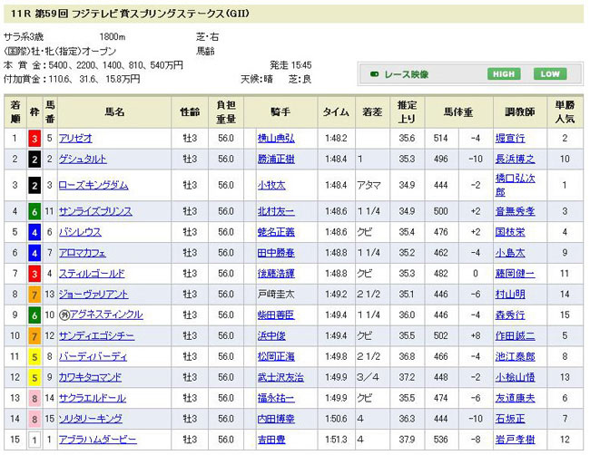 さて、今日はもう1つのGU戦がありました。毎年フジテレビの競馬中継でフジテレビ賞、フジテレビ賞と連呼してウザいw、フジテレビ社杯のスプリングステークスです(中山芝1800mGU)。