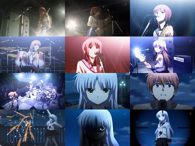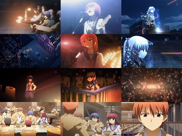 岩沢さんの陽動部隊・・・まさかガールズバンドとはw 戦線のメンバーが学食でゲリラライブを開催、それに酔い痴れる一般生徒たち・・・キャラソン販売決定ですなw そしてその騒ぎに気付いて学食へ向かう天使は、最も守備の弱いポイント・音無に接近します。与えられた銃で天使に攻撃を加える音無ですが、銃弾を受けても平然としている天使に動揺・・・。 ここで天使が音無の銃弾をはじくシーンで、その火花が0と1の数字で描かれているのに注目。というとここは2進法で構成されたデジタルな世界という事!?