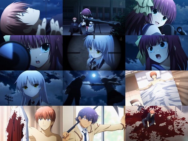 冒頭・・・突然見知らぬ世界で記憶を失って目を覚ます主人公・音無(CV:神谷浩史)。そして目の前でライフルを構えるハルh・・・げふんげふん、ゆりという少女(CV:平野・・・ではなくて櫻井浩美)。構え方が全然なっちゃいねぇけど、細かい事はあまり気にしないw ここは死者が来世に転生するまでの仮初めの世界。そこには死を受け入れずに、それを司る“天使”に抗うSOS団・・・じゃなくて“死んでたまるか戦線(後に死んだ世界戦線に変更)”の少年少女たちがいた−−− 厨と言えば厨な設定ですが、なかなかに斬新な設定です。麻枝氏の手腕によってどのように世界観が広がって行くのか期待したいところ。 ゆりたちが“天使”と呼ぶのは生徒会長を勤める長門系キャラ。自分が死んだ事が未だに信じられない音無は、それを問い質したばかりに天使に心臓を貫かれ・・・。 しかし翌朝、音無は普通に目を覚まします。この世界では死や病が存在しない・・・。そしてゆりからの戦線参加の頼みを断った事を逆恨みした野田というハルバート使いによって、今度は100回殺される音無w つーか血の描き方がかなりリアルです。黒塗り規制とかは大丈夫なのかな?