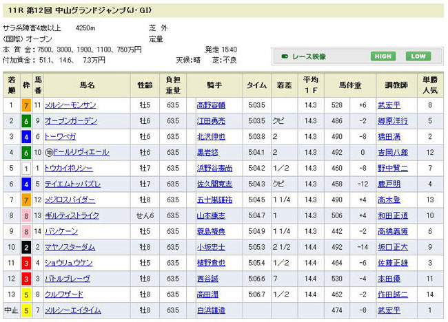 気を取り直して、今日はもう1つ重賞がありました。ジャンプのGT、中山グランドジャンプです。普段障害戦は滅多に買わないんですが、まぁGTなら・・・と気軽に参戦。 障害の馬はそんなに詳しく無いんですが、出馬表を見るとメルシーエイタイムが圧倒的な人気になっているようです。確かに中山を舞台にしたジャンプのGTで8戦1勝2着5回3着&4着各1回って戦績は凄い。しかし平地のダートレースをステップにしてGTに挑む過程が「?」な点と、主戦の横山(賀)騎手が調教中に落馬して負傷、今回乗り替わったのがワタシの大嫌いな白浜騎手って事で、この馬を無視した買い方をする事に決定。 中山コース実績から、◎トーワベガ ○ショウリュウケン ▲オープンガーデンとし、馬券は◎から○と▲にワイドで2点流しのみ購入。出馬表を見て1分くらいで適当に決めましたw 結果・・・